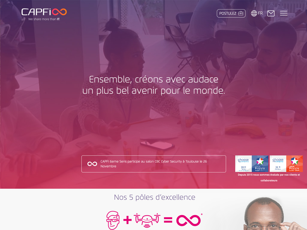 Refonte d’identité visuelle de Capfi Groupe, une entreprise de services numériques (SSII) spécialisée dans la transformation digitale, le design d’infrastructures IT et le consulting dédié aux secteurs finance, banque et assurance, project management, cybersecurité et cloud et big data.
