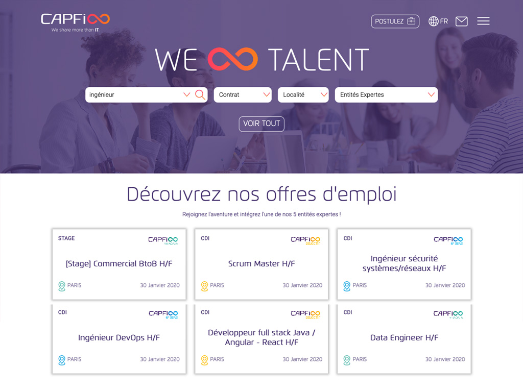 La refonte graphique du site web capfi.fr pour un site plus fonctionnel et un moteur de recherche d’offres d’emploi plus facile à consulter.