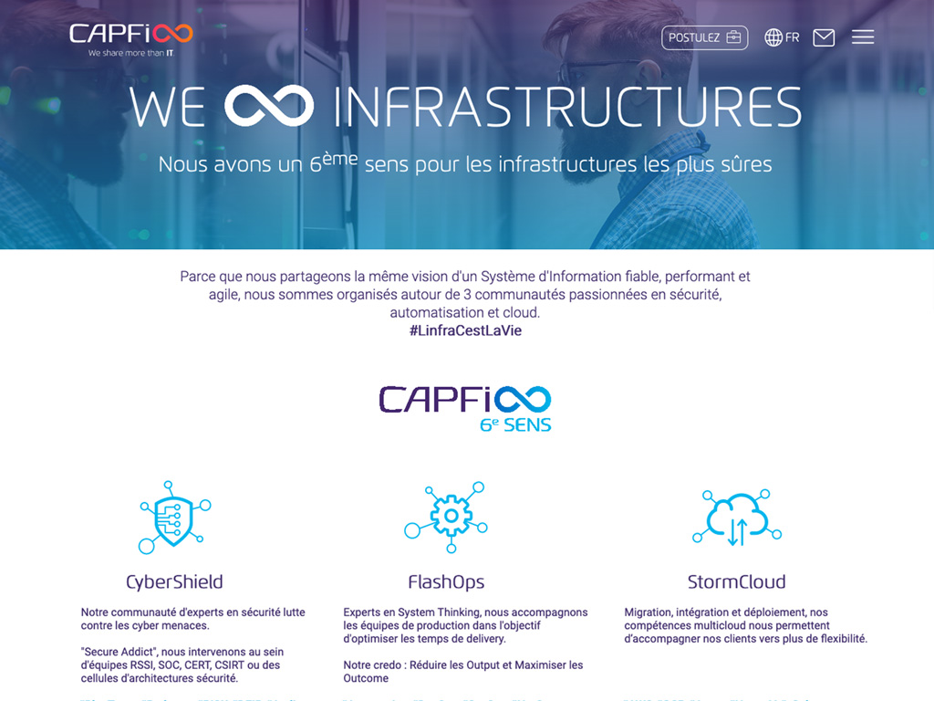 Les métiers de l’IT repoussent toujours les limites du possible. Ainsi, pour le logo, le symbole de l’infini a été choisi pour réunir toutes les pôles d’expertise du groupe. Le symbole infini du logo est baptisé « Capfinity » et utilisé comme un élément de syntaxe pour les déclinaisons créatifs.